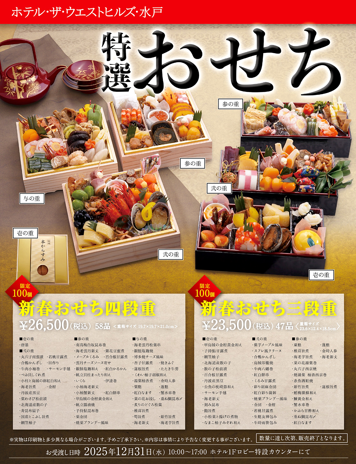 2025年12月31日(水)10:00〜17:00、ホテル1階ロビー特設カウンターでのお渡しとなります。