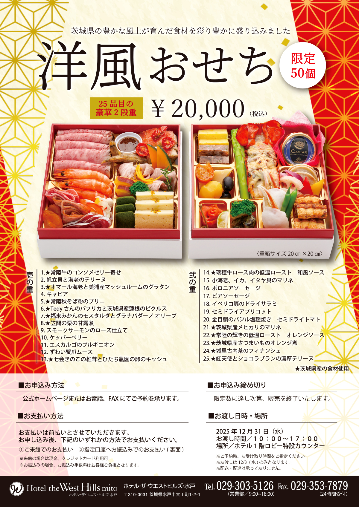 ![ホテル・ザ・ウェストヒルズ・水戸 2026年 洋風おせち2段重[全25品] ¥20,000 (税込)《限定50個》](https://westhills-mito.jp/hotel/wp-content/uploads/2025/09/2026osechi_b-s.jpg)