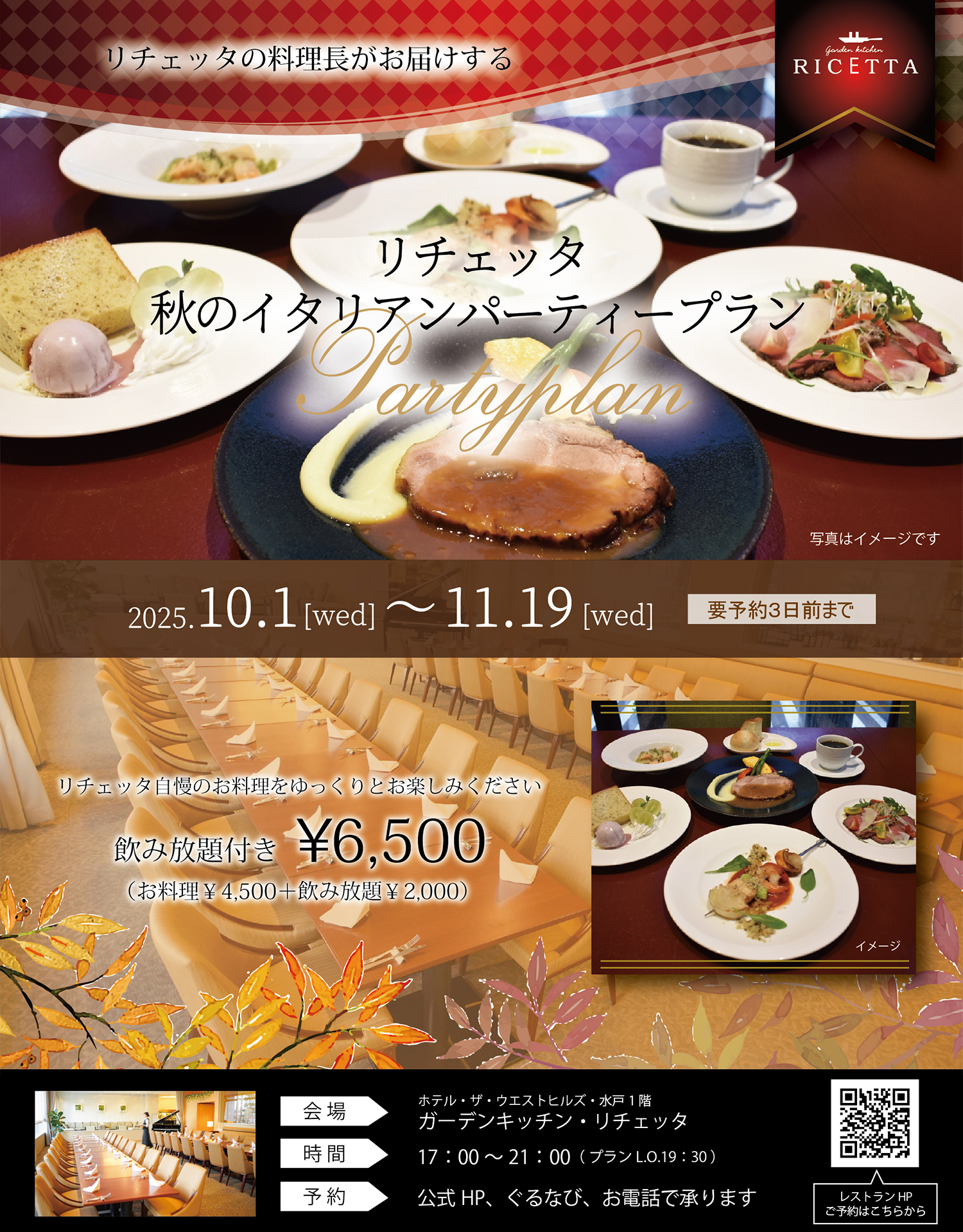 ホテル1階レストラン『ガーデンキッチン・リチェッタ』でご利用いただけるパーティープラン