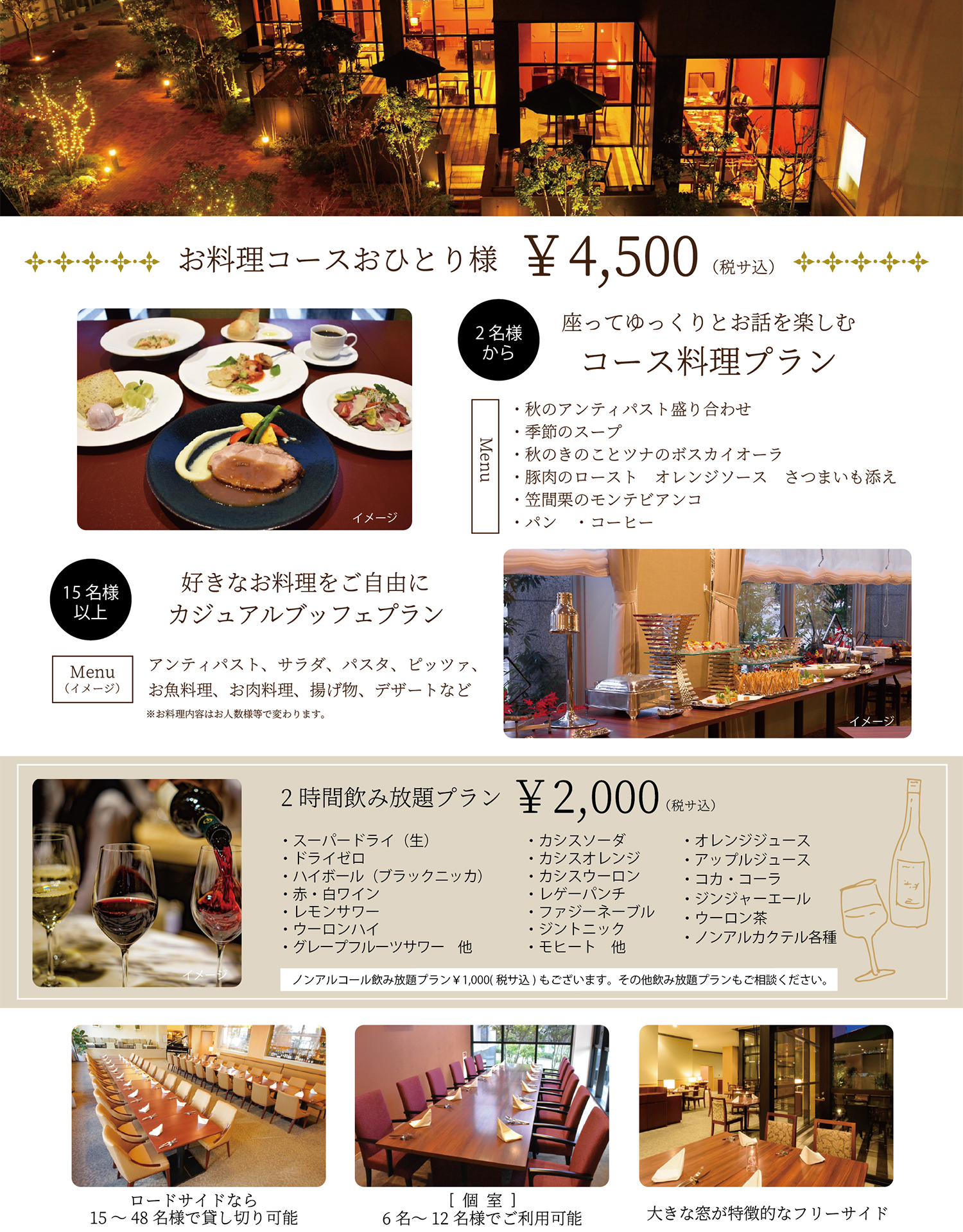 ご料金/2時間飲み放題付き¥6,500(税サ込/お一人様)