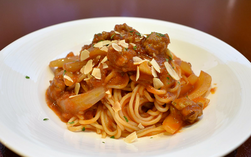 B. つくば鶏と茄子、長ネギのペペロンチーノ スパゲッティーニ