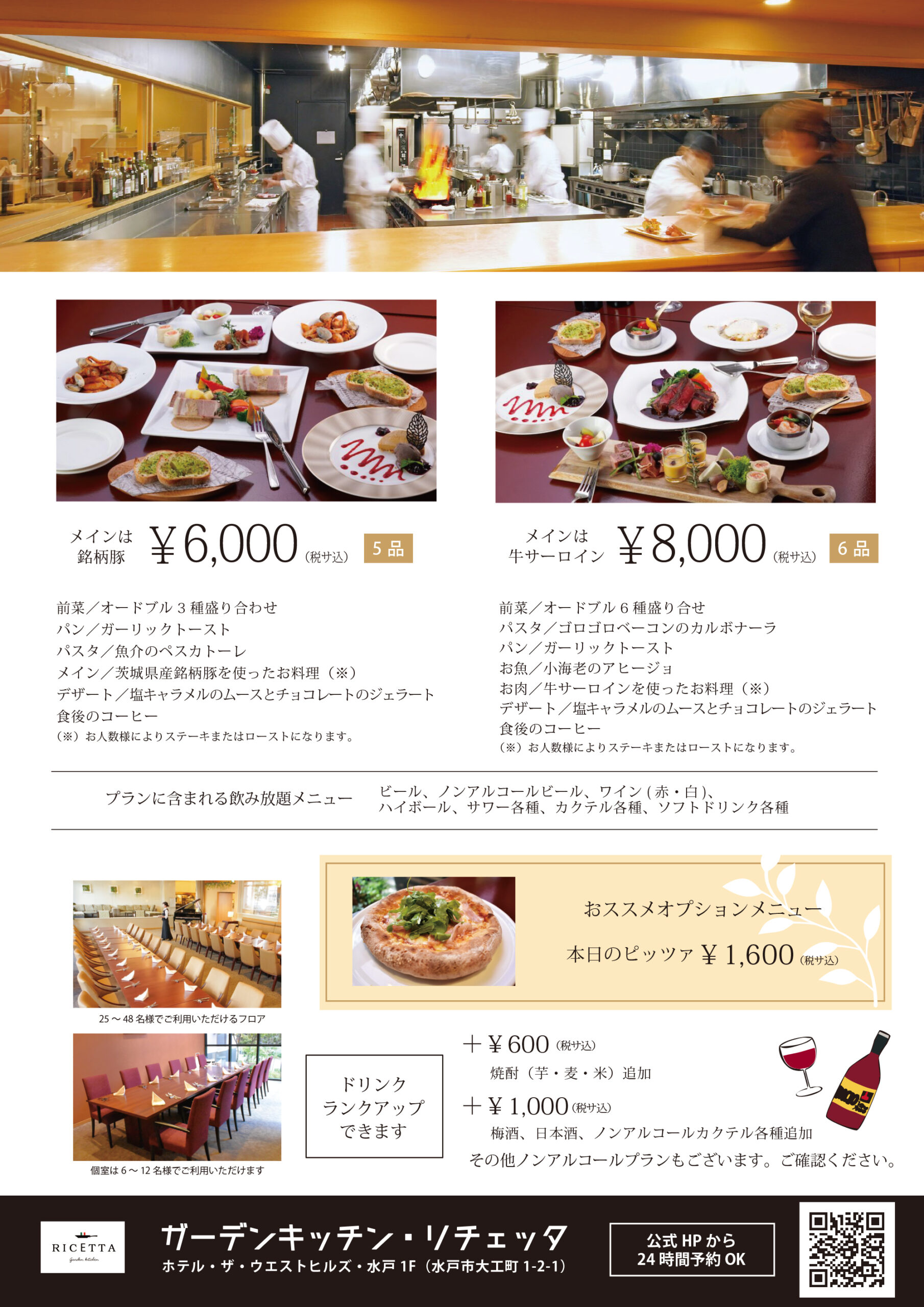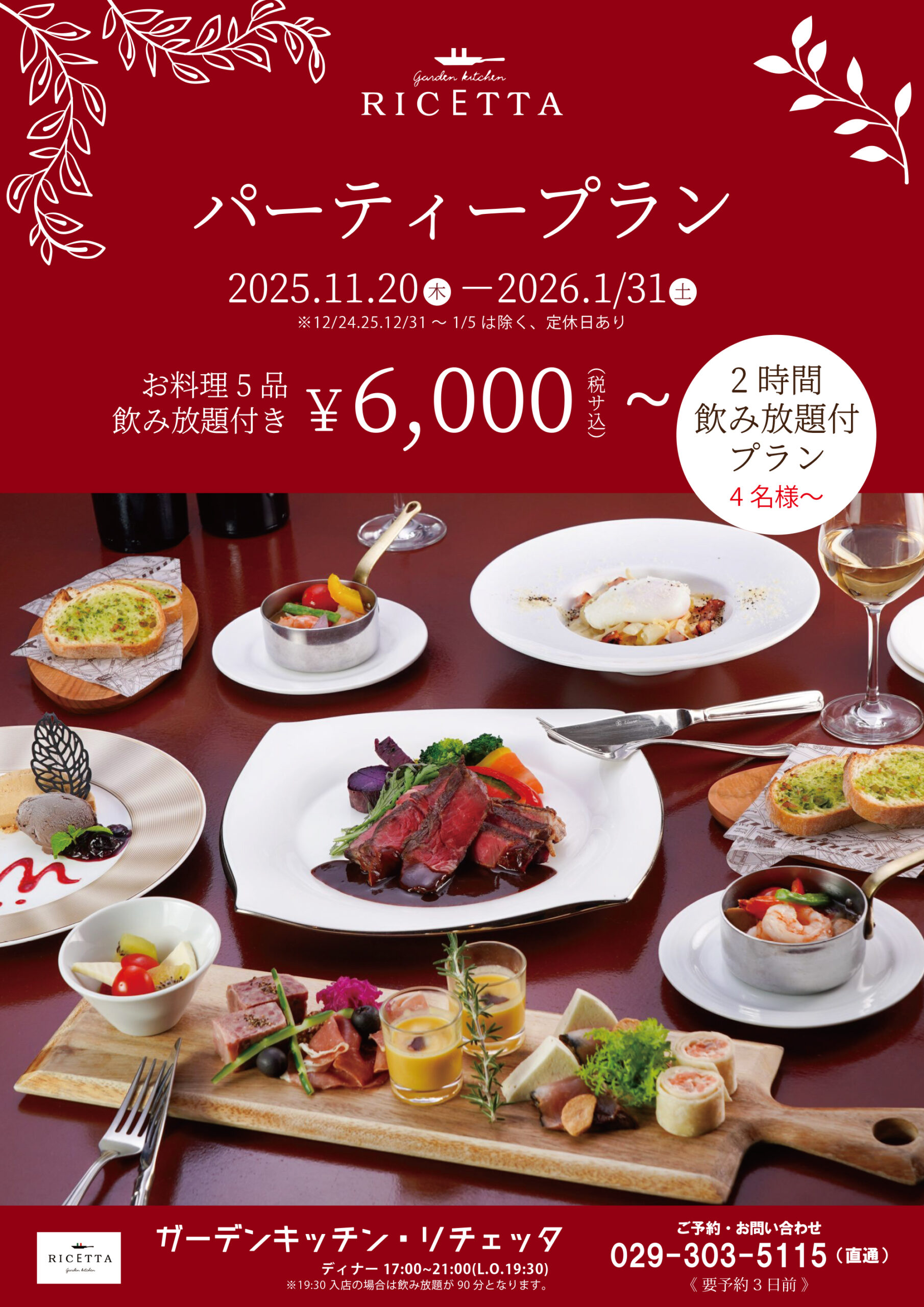 ホテル1階レストラン『ガーデンキッチン・リチェッタ』でも忘年会・新年会のご予約を承り中です。